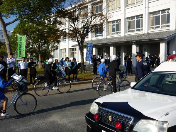 守山警察署の地域課の職員さんや地元の駐在所員さん、そして滋賀県軽自動車自転車商業共同組合員、生徒会の皆さんなど総勢40名強の大人数で防犯運動を行いました。