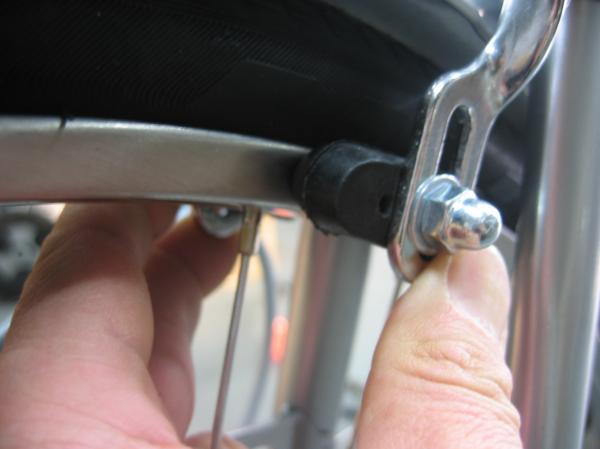 ブレーキゴムとリムとの隙間を左右均等に合わせます。