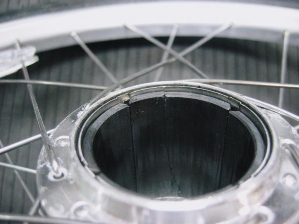 画像中央のオートライトハブAssyとスポーク・ニップル そしてリムに分解しました。