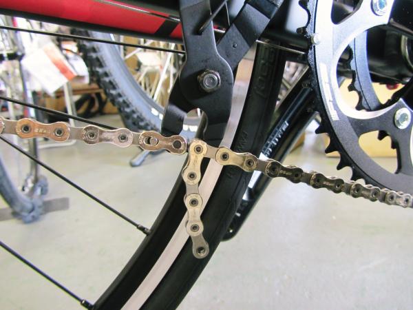 リヤのローギアが28T以上は、マウンテンバイク同様にチェーンを前後の一番大きなギアにかけて状態からプラス2コマ足すのが理想。