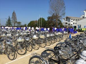 守山市内の中学校に出向いて、生徒の乗る自転車を点検。