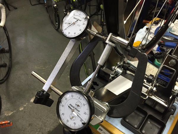 今日はホイールの振れ取り台にダイヤルゲージをセット!