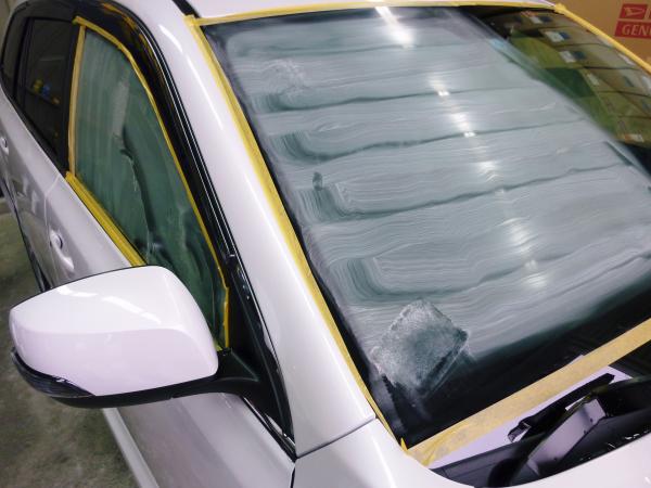 モールはこの様にマスキングを行い、その後、ガラス表面を専用のコンパウンドにて研磨します。