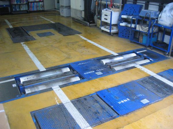 手前からサイドスリップ・スピード/ブレーキテスタ・調整用の埋め込み式リフト・ヘッドライトテスタ・排ガステスタなどが設置!