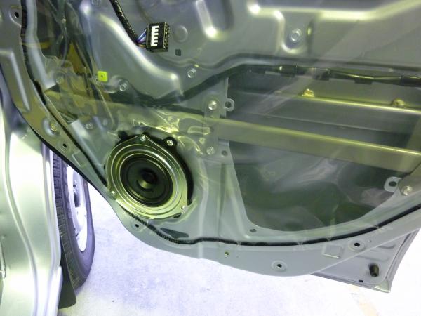フロントドアを分解してスピーカーを取り付け、内張りを切り抜きカバーを装着しています。
