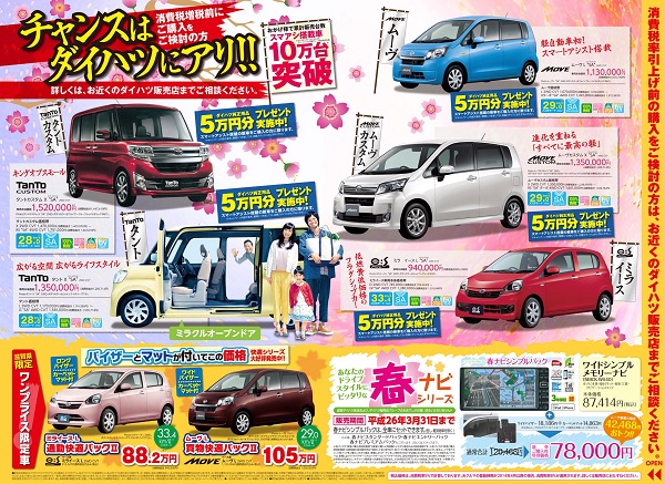 恒例のダイハツの大売出しを行うのですが、今回もお買い得車がいっぱいです。
