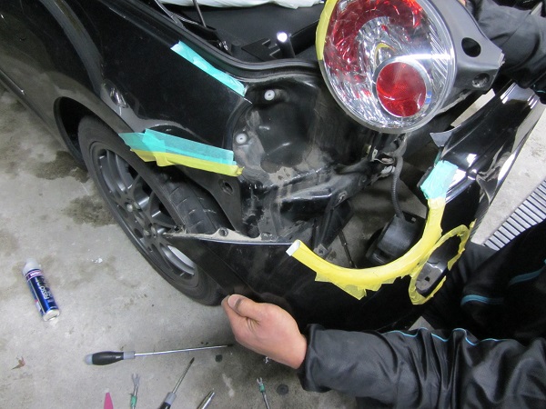 リヤバンパーカバーを浮かせながら、固定されたテールランプを外します。