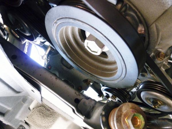 右フロントのタイヤハウス内のカバーを取外し、2本のベルトを調整。