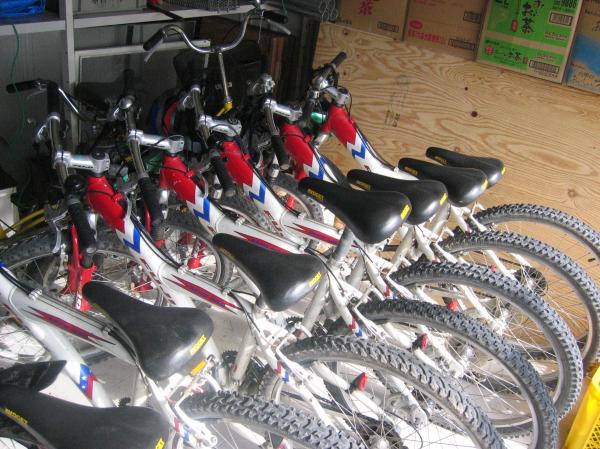 施設内で使用できるマウンテンバイクがずらり。総勢20台程。ヘルメットも用意されていました。
