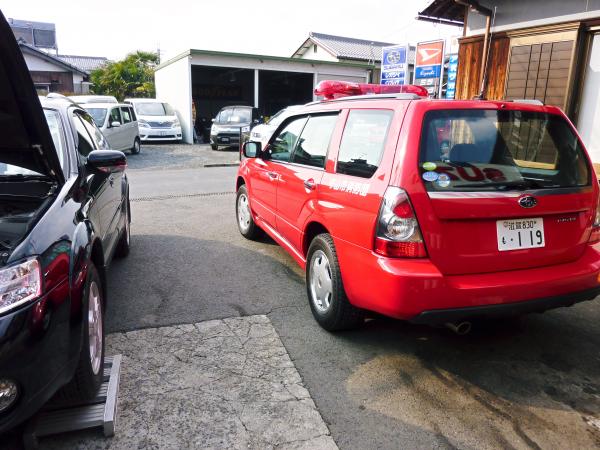 中州分団車庫の消防車にて数枚の写真撮影を行い、当店にて仕事風景の写真もとりました。