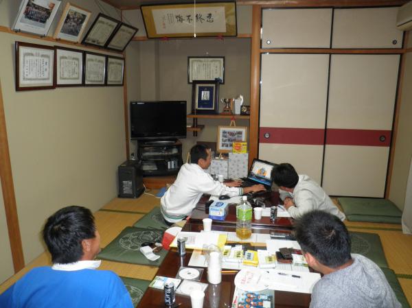 そのデータを編集してくれているのが、左奥の T 君(工務店オーナー)で、右奥でアドバイスしているのが指揮者 M15 さん(水道設備店オーナー)と右手前の2番員 I 君(会社員)と私の相棒、青いラガーシャツの3番員 W 君(瓦店オーナー)で1枚のDVDを作りました。
