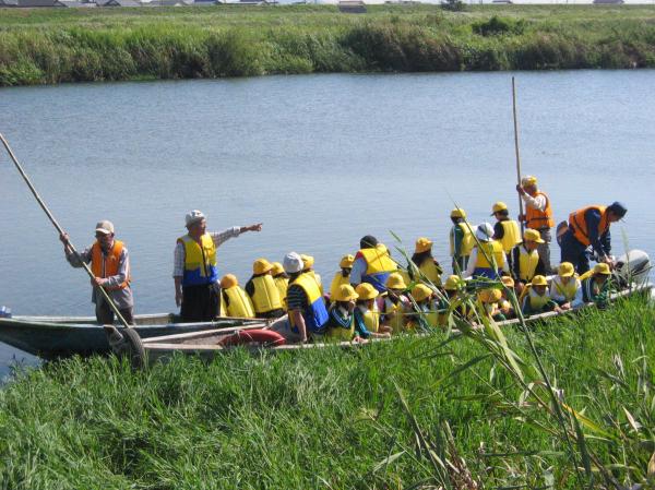 滋賀県の一級河川【野洲川】に舟を浮かべ生物・植物観察を行う授業です。