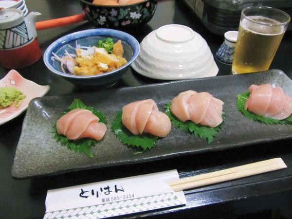 とりの刺身にかしわのすき焼きで〆はオジヤでした。